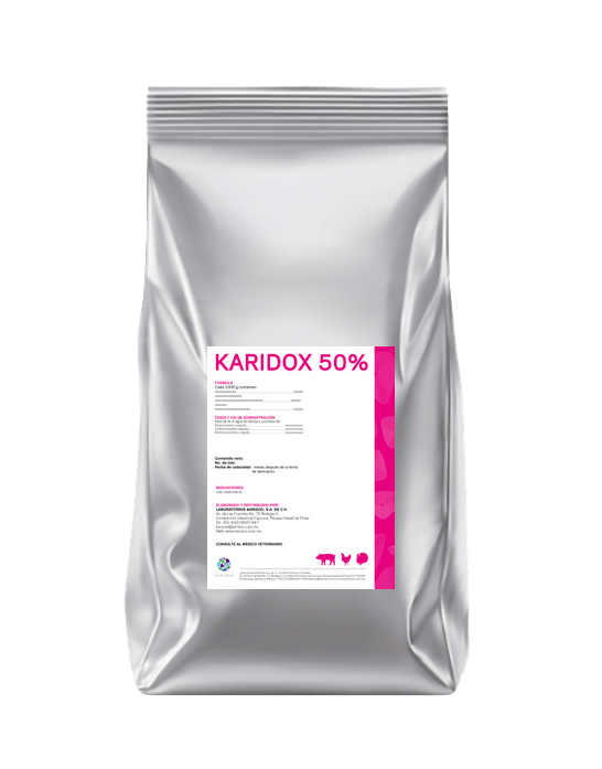 Porcinos y pollos: 23.1mg de doxiciclina hiclato por kg de peso vivo al día (equivalente a 40 mg de Karidox 50% polvo oral/kg de p.v), administrada en el agua de bebida durante 5 días consecutivos.