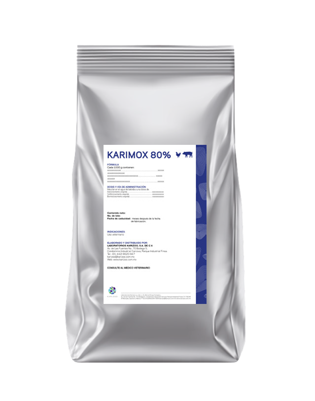 Karimox 80% polvo soluble está elaborado a base de amoxicilina trihidrata indicado para el tratamiento en infecciones sistémicas del aparato respiratorio, digestivo y urogenital causadas por gérmenes sensibles a la amoxicilina, así como a los gérmenes sensibles a la penicilina tales como: Staphylococcus spp., Streptococcus spp., Pasteurella spp., Clostridium spp., Salmonella spp., Haemophilus spp. y Escherichia coli.