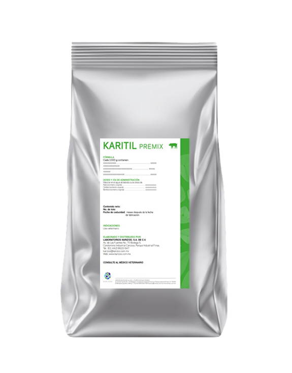 En bovinos, Karitil Premix puede agregarse al alimento para el tratamiento de Enfermedad Respiratoria Bovina (BRD) asociada a M. haemolytica, P. multocida y H. somni, en grupos de bovinos de carne y vacas no lactantes, diagnosticados con BRD activo, en al menos 10% de los animales del grupo.