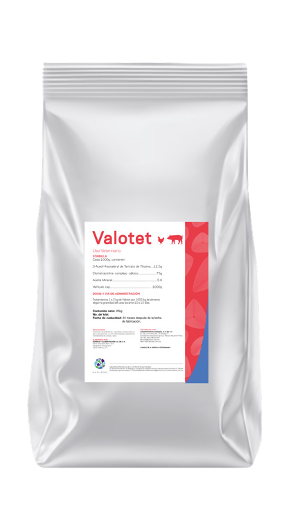 Aves y Cerdos: De 1 a 2 kg de VALOTET por tonelada de alimento balanceado, durante 7 a 14 días, según el cuadro e indicaciones del médico veterinario.